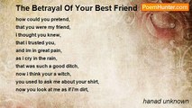 how could you pretend, <br />that you were my friend, <br />i thought you knew, <br />that i trusted you, <br />and im in great pain, <br />as i cry in the rain, <br />that was such a good ditch, <br />now i think your a witch, <br />you used to ask me about your shirt, <br />now you look at me as if i'm dirt, <br />at first i tried to deny it was the truth, <br />you know i tried but our friendship went poof, <br />you betray your freind, <br />was that the trend, <br />the look on your face, <br />and it was the end of the case, <br />i cant believe how much pain you put me through, <br />now this is the end, <br />and i hate you.<br /><br />hanad unknown<br /><br />http://www.poemhunter.com/poem/the-betrayal-of-your-best-friend/
