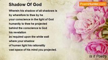 Wherein his shadow of all shadows is <br />by wherefore to thee by he <br />your conscience in the light of God <br />humanity to thee he projected <br />behind the conscience is God <br />his revelation <br />as required upon the white wall <br />where your shadow <br />of human light his rationality <br />vast space of his mind you projected.<br /><br />Is It Poetry<br /><br />http://www.poemhunter.com/poem/shadow-of-god-2/