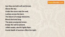 You are falling back into me where upon. <br />Found again in the sea. <br />Whereas because of the eye. <br />There you gained I am thinner. <br />Lines angles degree of separation. <br />It is lost <br />with the gathering opposite of your feet. <br />Red where the apple, and ripping. <br />Pure alabaster golden bodies. <br />Which I the sun have burnt. <br />Twin breasts with eyes of their own. <br />Your loveliness these two pillars coming I go, <br />and once more, the fire raises you up. <br />Symmetrical double length the wood. <br />The moon is smooth. <br />Each hemisphere which then billows, <br />you takeing I take it in. <br />The fruit the rich smell of earth, <br />and the coat of the cloud covered ocean. <br />The flower is circled by fire. <br />And the candle was lite the window left open, <br />rise and it expands. <br />Your body and now open your eyes.<br /><br />Is It Poetry<br /><br />http://www.poemhunter.com/poem/your-body-your-eyes/