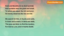 The Boundless Ocean of Brilliance <br />That lends the stars dazzling light <br />Whom obey flakes of the watery clouds, <br />Riding on the back of moving wind. <br />The Secret Hand that wrings them, <br />Pouring down waters on the soil. <br />That brings forth vitality all around, <br /> <br />Incarnates life from the objects lifeless. <br />Being that gurgles out the fountains, <br />From the womb of the Earth to quench, <br />Thirst of the parched dry throats. <br />Chief Host who treats all creatures, <br />Huge, small and very small, <br />With what they need to be sustained. <br /> <br />He who fills the petals delicate, <br />With, sap, colours and fragrance. <br />Infuses eagerness into flies and moths, <br />That hover around with ecstatic sway, <br />Over the overflowing Enchanting Beauty. <br /> <br />He whose Skillful Prudence, <br />And dynamic waves of thoughts, <br />Assume instant shapes, is God. <br />An absolute Reality and Truth <br />That needs no argument to be proved.<br /><br />Muhammad Shanazar<br /><br />http://www.poemhunter.com/poem/god-13/