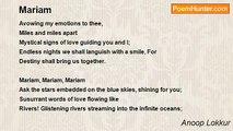Mariam, mariam, mariam <br />Aloud in my head your name resonates, <br />Reflections of you, of your sweetness, your innocence <br />In a desert like a mirage, <br />A picture of you in my eyes. <br />May the stars above shine on you forever. <br /> <br />Mariam, mariam, mariam <br />Ask the stars embedded on the blue skies, shining for you <br />Susurrant words of love flowing like <br />Rivers! glisteng rivers streaming into the infinte oceans; <br />In this poem, your name lives.<br /><br />Anoop Lokkur<br /><br />http://www.poemhunter.com/poem/mariam-mariam-mariam/