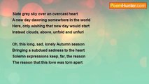 Staring out the window at leaves of red and gold <br />Gusts of wind spin them in a mix of rustic hue <br />Contrasting clouds, grey, above, overlap and fold <br />As the sun sets, bidding the long, cold day adieu <br /> <br />All of the trees are bare; and dying is the grass <br />The sun rises early and days quickly pass by <br />The scorching heat of the summer winds, gone at last <br />Too quickly, the frosty bite of winter draws nigh <br /> <br />Life moves slower and memories flood, deep, the heart <br />One can look and find no hope in these days of grey <br />Work seems harder and gains seem few and far apart <br />Hope dwindling further away, day after day <br /> <br />Lord, Giver of Life: for your people please provide <br />Comforter, Counselor: please heal these hurts inside <br />Savior, Messiah: from me, your grace, don’t divide <br />Almighty God, Creator: humbly we abide <br /> <br />For, in these times of great desperation and fear <br />It is then, beyond all other times, You draw near <br /> <br />((November 10th,2006))<br /><br />Danny Speicher<br /><br />http://www.poemhunter.com/poem/autumn-prayer-2/