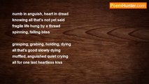Frosty fingers intertwine <br />elaborate lace, peering eyes <br />and what is this I feel inside? <br />what darkness is amiss? <br /> <br />heart so pallid, moon so cold <br />stars extinguished-black as coal <br />and what is this I feel inside <br />what final frigid kiss? <br /> <br />numb in anguish, heart in dread <br />knowing all that's not yet said <br />fragile life hung by a thread <br />spinning, falling bliss <br /> <br />grasping, grabing, holding, dying <br />all that's good slowly dying <br />muffled, anguished quiet crying <br />all for one last heartless kiss<br /><br />Lesley Taylor<br /><br />http://www.poemhunter.com/poem/an-almost-goodbye/