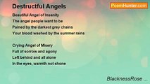 What is purer than snow <br />And falls frequently <br />Falling silently <br />From her <br />She sits above us <br />And watches our sin <br />What she sees scares her <br />And tells her what humans are <br />Her wings are a pure white <br />Adorning her back <br />Her white robes glowing <br />Making her appear innocent <br />She is pure, she is kind <br />But her eyes show sadness <br />She hears our jealousy <br />Our greed <br />She's afraid of what we've become <br />She wants to help <br />But when she tried <br />She was torn apart <br />Her wings grew grey <br />Her robes black <br />She can't stop the sin <br />So she'll destroy it <br />She is now an Angel of Death <br />Once fragile and kind <br />Her other side locked away <br />Adorned in chains <br />This Once Innocent Angel<br /><br />BlacknessRose ...<br /><br />http://www.poemhunter.com/poem/once-innocent-angel/
