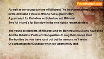 I hear the Finnow gurgling along <br />And robin sings his brief October song <br />And on deciduous trees leaves turning brown <br />In once green groves just out of Millstreet Town. <br /> <br />The winds of rain blow with a freshening chill <br />Across the old high fields by Clara hill <br />And skylark who sang in May, June and July <br />Up to the clouds to sing no longer fly. <br /> <br />At this time of year the flowers of Nature rare <br />Save for a few late blooming daisies here and there <br />By windswept hedgerows in the cold winds blowing <br />Where dormant grasses are no longer growing <br /> <br />A lot of rain and snow and frost between <br />Now and before birds building their nests can be seen <br />Before the golden flowers bloom by the rill <br />And Skylark sing above old Clara hill. <br /> <br />Leaves on deciduous trees are turning brown <br />And in the wind to Mother Earth drift down <br />And many bleak and cold days till the Spring <br />Before the birds their finest songs will sing.<br /><br />Francis Duggan<br /><br />http://www.poemhunter.com/poem/an-october-day-in-millstreet/
