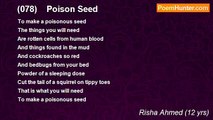 Thank you Risha, <br />For being the pleasure <br />And treasure of poemhunter… <br /> <br />Risha, <br />At your age of ten, <br />I were learning only <br />The English alphabets! <br /> <br />Risha, <br />You are like ocean Pacific! <br />So calm outer <br />Strong currents underneath <br />Straight goes your poems <br />Into the heart <br />Not into the head <br />Where only intelligence <br />Is stored… <br /> <br />Risha, <br />Open your beautiful eyes wide <br />Keep your antennas up <br />Every moment <br />And receive the signals of nature <br />Transmit them through poetry <br /> <br />Risha, <br />Someday in future <br />You will be the <br />Poetic ambassador of Bharat* <br /> <br />Risha, <br />Before I close my pen <br />I should tell you something <br />Never forget our mother-tongue ‘Malayalam’ <br />She only gave you ideas <br />For ideas are the seedlings of poetry… <br />Thank you Risha <br />For you brought me to <br />Poemhunter family… <br /> <br /> <br />India <br /> <br />Risha Ahmed is only ten years old. She has already penned down more than 125 poems.<br /><br />premji premji<br /><br />http://www.poemhunter.com/poem/078-risha-is-a-wonderful-poet/