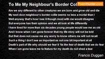 Old Rupert the border collie his muzzle is gray <br />And clearly he has known a far better day <br />His kind master Gen of him does take good care <br />As she says the Rupert Dogs of this World are rare <br />A gentle dog not the type to snarl or bite <br />Rupert the beautiful old black and white <br />Good dogs like good people are destined to grow old <br />Though in book form Rupert's life story may never be told <br />He was in his prime going back ten years ago <br />And his fastest pace now is to say the least slow <br />The praises of Rupert his master does sing <br />But for dogs as for people there is no second life's Spring <br />The Seasons on Rupert beginning to show <br />He was in his life's prime a decade ago.<br /><br />Francis Duggan<br /><br />http://www.poemhunter.com/poem/old-rupert-the-border-collie/