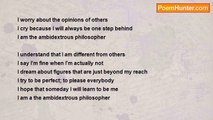 I am blind; I cannot see. <br />I touch my face. I wonder... <br />How do I look like? <br />I move from my neck to my jawbone. <br />It's high and angled; I must look elegant. <br />My lips are full, and ears are right. <br />I stroke my cheeks: no bumps, no blemishes. <br />Finally, it satisfies me. <br />My love comes, confirms and says: <br />'Hey beautiful.'<br /><br />Cheryl Cheng<br /><br />http://www.poemhunter.com/poem/face-16/