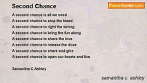 Everything was perfect. <br />Then we got torn apart. <br />Lost Love. <br />Tears every night. <br />Wishing to be with you again. <br />I pick up my phone, <br />Then I set it back down. <br />Cause I know Im wasting my time. <br />But I dont mind. <br />And then my phone bows up with your ringtone. <br />I hesitate, <br />but I hit the little green button. <br />You say how you miss me and need me back in your arms once more. <br />Now we are together. <br />Happier than ever. <br />Makin plans. <br />Im blessed to say that I have been given the second chance of a lifetime. <br />I Love You!<br /><br />Ashley Nichol<br /><br />http://www.poemhunter.com/poem/second-chance-15/