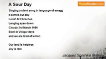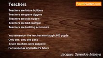 A young and energetic teaching mind is quiet <br />And now everyone is quiet <br />Kind helping hand is close <br />And everyone is helpless <br />What a Gentle, Gentleman <br /> <br />When a dark cloud falls <br />Falls upon us, it’s always hard <br />Hard to accept, then we became sad <br />Agreement became disagreement <br />Assertiveness became aggressiveness <br />Beyond and behind believing <br />There is a space of rest <br />A comfort zone of peace <br /> <br />Hell it’s not well <br />Choose heaven for rest <br />To rest like the rest <br /> <br />When time comes <br />Your good work will follow <br />And almighty God will have mercy on you <br />For the rest of your rest <br />And rest like the rest<br /><br />Jacques Sprenkie Mateya<br /><br />http://www.poemhunter.com/poem/a-teacher-who-thought-me-died-and-then-i-wrote/