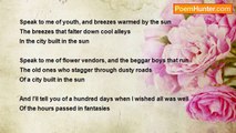 I walked on the sidewalks, <br />Of the city. <br />I met rich people and poor. <br />I met people who just sat there, <br />And I met a doer. <br /> <br />The cabs drove by, <br />In hasty speed. <br />One cab drove past me, <br />In others' lead. <br /> <br />The rich ones and poor, <br />Seemed like they were, <br />Playing a role in a drama. <br />A city of lit-up buildings. <br /> <br />An electric drama of the city. <br /> <br /> <br />No matter where I roamed, <br />In the city, <br />People and buildings, <br />Loomed everywhere. <br /> <br />In an electric drama of the city.<br /><br />Vera Sidhwa<br /><br />http://www.poemhunter.com/poem/city-17/