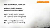 What God has put together <br />Let no man put asunder <br /> <br />Marriage is a holy matrimony <br />Sacred vow dream by so many <br /> <br />Man and woman become one <br />Where single blessedness is gone <br /> <br />In marriage one may goes astray <br />While the other kneels down to pray <br /> <br />Somehow a hollow is created <br />Where another soul is well fitted <br /> <br />And so the love once so endeared <br />Has excites a curse becoming dread <br /> <br />While savoring other love in lust <br />The original love accumulates rust <br /> <br />A sacrament made with love in solemnity <br />Now has became marred with sinful infidelity<br /><br />Marvin Brato Sr<br /><br />http://www.poemhunter.com/poem/infidelity-32/