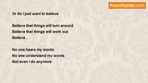 What happened to me <br />What is happening to me <br />I am fading <br />Becoming unknown <br />To the one and only I knew <br />ME <br /> <br />I am broken <br />I am sad <br />I am crushed, <br />All I have know about me <br /> Suffocating <br />Becoming unknown <br />And made to feel all forlorn <br /> <br />I want to cry <br />I am crying, drowning in my tears <br />It's overwhelming <br />I wanna explode <br />I can't hold it anymore <br />I am slowly but surely losing what's dear to me <br />Myself <br /> <br />Why am I sad about it <br />Maybe it's a good thing <br />Not to be anymore <br />Not to be part anymore <br />To raise my white flag <br />And no longer be<br /><br />Lizelle 'Leasel' Martins<br /><br />http://www.poemhunter.com/poem/i-am-fading-2/