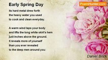 Against the sun-wall of air <br />the birds disguise themselves <br />as their own shadows, <br />before settling invisibly among the leaves. <br />A medley of songs pours from the tree screen. <br />Was that blink of blue a blue-jay? <br />That flash of red a cardinal? <br />Nothing lasts long enough <br />in April to be certain. <br /> <br />Green claims the landscape, but gray <br />bark still covers a leafless tree: Is it dead, <br />or a late bloomer? The tiny leaves <br />of a willow press its branches <br />down toward the pond's surface. <br />Will heavier leaves soon <br />dip those branches into the water? <br />Or will they hover like Tantalus's lips <br />just above the pond all summer long? <br /> <br />A black dog parallels my steps, <br />barking fiercely and lunging at me, <br />but she does not cross the lawn's edge. <br />Her bite is certainly worse than her bark, <br />but I have no fear. When I fan <br />my fingers into a wave good-bye, she hops <br />in a circle, no longer barking or lunging. <br />Disarmed by my quiet lack of threat, <br />she slips back into her proper role as pet.<br /><br />Daniel Brick<br /><br />http://www.poemhunter.com/poem/a-walk-in-early-april/
