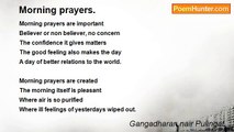 Prayers have wonderful meanings <br />Relates to the universal power <br />The nature, and wonderful imaginations <br />The positive vibrations it gives. <br /> <br />Prayers have soothing effect <br />To the mind, body and intellect <br />where unison with the unknown <br />In whatever name, and way we prays. <br /> <br />Beliefs are varied but minds are united <br />where prayer helps to minds in correctness <br />Starting a day with a suitable prayer <br />Helps us to relieve that days woes. <br />To make us confidence in its spirit.<br /><br />Gangadharan nair Pulingat..<br /><br />http://www.poemhunter.com/poem/prayer-227/