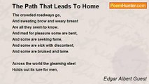 NEVER so happy as when I 'm at home, <br />I 'm not so anxious to wander or roam; <br />Rather sit down with the folks who love me, <br />With somebody's youngster astride of my knee, <br />And gallop him off to the wonderful land, <br />Where armies are waiting his word to command, <br />Than listen to speeches by eloquent men <br />Who shout for an hour and then sit down again. <br /> <br />Never so happy as when I 'm at home, <br />Rather play tunes with a paper and comb <br />For a boy or a girl who may drop in to call, <br />For it's there that I shine if I do shine at all; <br />Rather sing ditties to tots that I know, <br />Than go to a party or go to a show, <br />Or listen to grown-ups with wisdom expound, <br />As their arms saw the air, and the tables they pound. <br /> <br />Never so happy as when I 'm at home, <br />Don't care to journey to Naples or Rome, <br />Rather stay here with the folks who love me, <br />Than run after strangers whoever they be; <br />A nod from a king or a smile from a lord <br />Wouldn't please me a bit. I 'd be terribly bored; <br />Rather stay here where I 'm loved and I 'm known, <br />Than get on my knees before any old throne.<br /><br />Edgar Albert Guest<br /><br />http://www.poemhunter.com/poem/rather-stay-home/