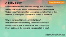 "I want to live alone" <br />She was assertive in tone <br />Why do not then leave? <br />I asked her "if you believe" <br /> <br />"No no dear, neither is it mental <br />Nor personal <br />It has to do with body <br />Can be shared by nobody <br /> <br />Yes, some medical advice <br />To be in bed till it suffices <br />I need to be careful <br />As it is so much painful <br /> <br />I felt so much relief that had remained <br />Even though regretted her pain <br />It was natural with woman <br />To undergo often <br /> <br />"I want baby" <br />That is desire of each lady <br />It is blessings from almighty <br />It serves purpose of divinity <br /> <br />How can woman be complete? <br />Without it <br />I understood her point very clear <br />She had genuine fear<br /><br />hasmukh amathalal<br /><br />http://www.poemhunter.com/poem/i-want-baby/