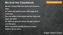 There've been times we'd disagree <br />Somethin' awful, Ma an' me; <br />Times when I would bang the door <br />Never to come back no more, <br />An' go stompin' down the street <br />Sayin' things I won't repeat; <br />Vowin' that the only course <br />For us two was a di-vorce. <br />Then when it come time for tea <br />We'd make up, would Ma an' me. <br /> <br />We've had many a lively spat <br />Arguin' over this an' that. <br />There've been times when Ma got mad, <br />Said enough o' me she'd had, <br />Tired o' listenin' to me jaw; <br />Reckoned that she'd go t' law, <br />Tell the judge her tale o' woe, <br />An' my own way I could go. <br />Then the children we would see <br />An' we'd laugh, would Ma an' me. <br /> <br />Ma an' me ain't angels quite, <br />Neither of us does things right. <br />She's got reason fer complaint, <br />She ain't married to a saint; <br />Guess I've tried her patience more <br />Than the children round the door; <br />An' at times, by all that's fine, <br />Ma has certainly tried mine. <br />But together still are we, <br />Pals an' lovers — Ma an' me. <br /> <br />We've just plodded on the way <br />Hand in hand from day to day, <br />Workin' for the greatest good, <br />Doin' just the best we could. <br />Gettin' mad, as people will, <br />But remainin' faithful still. <br />An' we've never gone to bed <br />Till we took back all we said, <br />Kissed, an' vowed we'd always be <br />Pals an' sweethearts—Ma an' me.<br /><br />Edgar Albert Guest<br /><br />http://www.poemhunter.com/poem/ma-an-me/