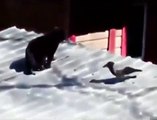 Un corbeau taquine deux chats en pleine bagarre