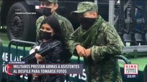 Jóvenes se sacan foto con arma de soldado durante el Desfile Militar