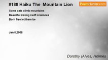 Haiku Heading Home <br />CLOUDS EDGED IN SUNLIGHT <br />PAINTED THE TWILIGHT SKY blue, <br />GOLD, with PINK PATCHES <br /> <br />June 28,2013 <br />9: 51 p.m. <br /> <br />Dorothy Alves Holmes <br />A Poet Who Loves To Sing<br /><br />Dorothy (Alves) Holmes<br /><br />http://www.poemhunter.com/poem/haiku-heading-home/