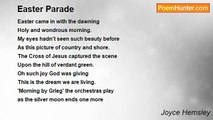 We all came along to the Easter parade <br />The girls with their bonnets and men with their plaids <br />And the children with baskets of chocolate eggs <br />And mothers home cooking for a family spread <br /> <br />We walked to the field where the old hayloft stands <br />With music being played by The Pioneer Band <br />Where granma and granpa caught many a glance <br />Blazing a trail at the festival dance <br /> <br />And the pie competition was drama indeed <br />As the judge said the winner was his little niece <br />And the Reverend stepped in to calm down all the fuss <br />“Today is for Jesus, Not pies, And not us” <br /> <br />Young men being boisterous sought some attention <br />From girls who quite simply just wanted affection <br />And avoiding their mothers, slipped quietly away <br />for the first teenage kiss of the Easter parade.<br /><br />Charles M. Moore<br /><br />http://www.poemhunter.com/poem/the-easter-parade/