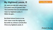 Ye banks, and braes, and streams around <br /> The castle o' Montgomery, <br />Green be your woods, and fair your flowers, <br /> Your waters never drumlie! <br />There Simmer first unfald her robes, <br /> And there the langest tarry: <br />For there I took the last Fareweel <br /> O' my sweet Highland Mary. <br /> <br />How sweetly bloom'd the gay, green birk, <br /> How rich the hawthorn's blossom; <br />As underneath their fragrant shade, <br /> I clasp'd her to my bosom! <br />The golden Hours, on angel wings, <br /> Flew o'er me and my Dearie; <br />For dear to me as light and life <br /> Was my sweet Highland Mary. <br /> <br />Wi' mony a vow, and lock'd embrace, <br /> Our parting was fu' tender; <br />And pledging aft to meet again, <br /> We tore oursels asunder: <br />But Oh, fell Death's untimely frost, <br /> That nipt my Flower sae early! <br />Now green's the sod, and cauld's the clay, <br /> That wraps my Highland Mary! <br /> <br />O pale, pale now, those rosy lips <br /> I aft hae kiss'd sae fondly! <br />And clos'd for ay, the sparkling glance, <br /> That dwalt on me sae kindly! <br />And mouldering now in silent dust, <br /> That heart that lo'ed me dearly! <br />But still within my bosom's core <br /> Shall live my Highland Mary.<br /><br />Robert Burns<br /><br />http://www.poemhunter.com/poem/highland-mary/