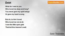 What do I owe to you <br /> Who loved me deep and long? <br />You never gave my spirit wings <br /> Or gave my heart a song. <br /> <br />But oh, to him I loved, <br /> Who loved me not at all, <br />I owe the open gate <br /> That led through heaven's wall.<br /><br />Sara Teasdale<br /><br />http://www.poemhunter.com/poem/debt/