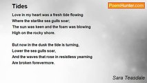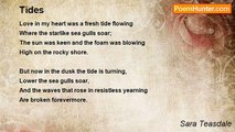 When the long day goes by <br /> And I do not see your face, <br />The old wild, restless sorrow <br /> Steals from its hiding place. <br /> <br />My day is barren and broken, <br /> Bereft of light and song, <br />A sea beach bleak and windy <br /> That moans the whole day long. <br /> <br />To the empty beach at ebb tide, <br /> Bare with its rocks and scars, <br />Come back like the sea with singing, <br /> And light of a million stars.<br /><br />Sara Teasdale<br /><br />http://www.poemhunter.com/poem/ebb-tide/