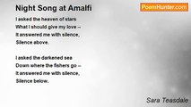 I asked the heaven of stars <br /> What I should give my love -- <br />It answered me with silence, <br /> Silence above. <br /> <br />I asked the darkened sea <br /> Down where the fishers go -- <br />It answered me with silence, <br /> Silence below. <br /> <br />Oh, I could give him weeping, <br /> Or I could give him song -- <br />But how can I give silence, <br /> My whole life long?<br /><br />Sara Teasdale<br /><br />http://www.poemhunter.com/poem/night-song-at-amalfi/
