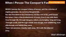 WHEN I heard at the close of the day how my name had been receiv'd <br /> with plaudits in the capitol, still it was not a happy night <br /> for me that follow'd; <br /> And else, when I carous'd, or when my plans were accomplish'd, still <br /> I was not happy; <br /> But the day when I rose at dawn from the bed of perfect health, <br /> refresh'd, singing, inhaling the ripe breath of autumn, <br /> When I saw the full moon in the west grow pale and disappear in the <br /> morning light, <br /> When I wander'd alone over the beach, and undressing, bathed, <br /> laughing with the cool waters, and saw the sun rise, <br /> And when I thought how my dear friend, my lover, was on his way <br /> coming, O then I was happy; <br /> O then each breath tasted sweeter--and all that day my food nourish'd <br /> me more--and the beautiful day pass'd well, <br /> And the next came with equal joy--and with the next, at evening, came <br /> my friend; <br /> And that night, while all was still, I heard the waters roll slowly <br /> continually up the shores, <br /> I heard the hissing rustle of the liquid and sands, as directed to <br /> me, whispering, to congratulate me, 10 <br /> For the one I love most lay sleeping by me under the same cover in <br /> the cool night, <br /> In the stillness, in the autumn moonbeams, his face was inclined <br /> toward me, <br /> And his arm lay lightly around my breast--and that night I was happy.<br /><br />Walt Whitman<br /><br />http://www.poemhunter.com/poem/when-i-heard-at-the-close-of-the-day/