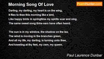 The mist has left the greening plain, <br />The dew-drops shine like fairy rain, <br />The coquette rose awakes again <br />Her lovely self adorning. <br /> <br />The Wind is hiding in the trees, <br />A sighing, soothing, laughing tease, <br />Until the rose says "Kiss me, please," <br />'Tis morning, 'tis morning. <br /> <br />With staff in hand and careless-free, <br />The wanderer fares right jauntily, <br />For towns and houses are, thinks he, <br />For scorning, for scorning. <br />My soul is swift upon the wing, <br />And in its deeps a song I bring; <br />Come, Love, and we together sing, <br />"'Tis morning, 'tis morning."<br /><br />Paul Laurence Dunbar<br /><br />http://www.poemhunter.com/poem/morning/