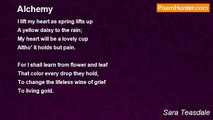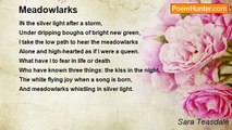 In the silver light after a storm, <br />Under dripping boughs of bright new green, <br />I take the low path to hear the meadowlarks <br />Alone and high-hearted as if I were a queen. <br />What have I to fear in life or death <br />Who have known three things: the kiss in the night, <br />The white flying joy when a song is born, <br />And meadowlarks whistling in silver light.<br /><br />Sara Teasdale<br /><br />http://www.poemhunter.com/poem/meadowlarks/