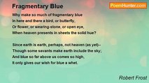 Why make so much of fragmentary blue <br />In here and there a bird, or butterfly, <br />Or flower, or wearing-stone, or open eye, <br />When heaven presents in sheets the solid hue? <br /> <br />Since earth is earth, perhaps, not heaven (as yet)-- <br />Though some savants make earth include the sky; <br />And blue so far above us comes so high, <br />It only gives our wish for blue a whet.<br /><br />Robert Lee Frost<br /><br />http://www.poemhunter.com/poem/fragmentary-blue-2/