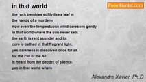 the time is nigh <br /> the drop starts <br /> to develop the ocean <br /> fountains of blue blood <br /> begin to gush forth <br /> as the pressures of destiny <br /> close in on itself <br /> pounded bones and crushed flesh <br /> are strewn to welcome <br /> that which is never welcomed <br /> lick all that is fresh today <br /> for tomorrow only the seething oozing <br /> puss of silly remorse shall remain <br /> even the marrow will not be spared <br /> but day after the morrow <br /> the time is no more nigh <br /> for then even time is no more <br /> when "harmony" is left in a bloody grave<br /><br />Alexandre Xavier, Ph.D<br /><br />http://www.poemhunter.com/poem/communal-quot-harmony-quot/