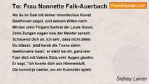 A white face, drooping, on a bending neck: <br /> A tube-rose that with heavy petal curves <br /> Her stem: a foam-bell on a wave that swerves <br />Back from the undulating vessel's deck. <br /> <br />From out the whitest cloud of summer steals <br /> The wildest lightning: from this face of thine <br /> Thy soul, a fire-of-heaven, warm and fine, <br />In marvellous flashes its fair self reveals. <br /> <br />As when one gazes from the summer sea <br /> On some far gossamer cloud, with straining eye, <br /> Fearing to see it vanish in the sky, <br />So, floating, wandering Cloud-Soul, I watch thee.<br /><br />Sidney Lanier<br /><br />http://www.poemhunter.com/poem/to-wilhelmina/
