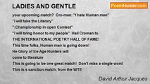 We smoked <br />I listened to their story <br />And said, "Today I will fight" <br />" I will be your champion" <br />"You will be my people" <br />Then they broke their weapons <br />And left my sight! I am Cro-man, not man or beast<br /><br />David Arthur Jacques<br /><br />http://www.poemhunter.com/poem/in-the-garden-2/