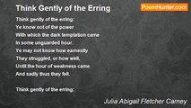 Gently on the stream of time, <br />We are floating day by day, <br />In life's native boats sublime <br />We soon anchor in the bay. <br />We'll soon anchor in the haven, <br />Where the weary are at rest, <br />In that blissful port called Heaven, <br />Where are roaming now the blest. <br /> <br />CHORUS: <br /> <br />Be gentle, time be gentle with us, <br />While we are on life's troubled stream, <br />May life's foaming billows o'er us <br />Break away as day serene. <br />Gently on the stream of time, <br />We will swiftly glide along, <br />Till we reach the realm divine, <br />Then we'll join the heavenly throng, <br />Where our friends have gone before us <br />Waiting on the other shore. <br /> <br />In that home they sing in chorus, <br />"Welcome home the rich and poor." <br />Gently on the stream of time, <br />We shall shortly pass away, <br />We shall reach the heavenly clime <br />If God's commands we obey. <br />Gently on the stream of time <br />We are going one by one, <br />Listening to the evening chime <br />On life's journey going home.<br /><br />Julia A Moore<br /><br />http://www.poemhunter.com/poem/gently-on-the-stream-of-time/