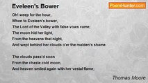 Oh! weep for the hour, <br />When to Eveleen's bower, <br />The Lord of the Valley with false vows came; <br />The moon hid her light, <br />From the heavens that night, <br />And wept behind her clouds o'er the maiden's shame. <br /> <br />The clouds pass'd soon <br />From the chaste cold moon, <br />And heaven smiled again with her vestal flame; <br />But none will see the day, <br />When the clouds shall pass away, <br />Which that dark hour left upon Eveleen's fame. <br /> <br />The white snow lay <br />On the narrow path-way, <br />When the Lord of the Valley cross'd over the moor; <br />And many a deep print <br />On the white snow's tint <br />Show'd the track of his footstep to Eveleen's door. <br /> <br />The next sun's ray <br />Soon melted away <br />Every trace on the path where the false Lord came; <br />But there's a light above, <br />Which alone can remove <br />That stain upon the snow of fair Eveleen's fame.<br /><br />Thomas Moore<br /><br />http://www.poemhunter.com/poem/eveleen-s-bower/