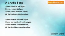 Sleep, sleep, beauty bright, <br />Dreaming in the joys of night; <br />Sleep, sleep; in thy sleep <br />Little sorrows sit and weep. <br /> <br />Sweet babe, in thy face <br />Soft desires I can trace, <br />Secret joys and secret smiles, <br />Little pretty infant wiles. <br /> <br />As thy softest limbs I feel <br />Smiles as of the morning steal <br />O'er thy cheek, and o'er thy breast <br />Where thy little heart doth rest. <br /> <br />O the cunning wiles that creep <br />In thy little heart asleep! <br />When thy little heart doth wake, <br />Then the dreadful night shall break.<br /><br />William Blake<br /><br />http://www.poemhunter.com/poem/cradle-song/