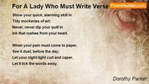 Oh, I can smile for you, and tilt my head, <br />And drink your rushing words with eager lips, <br />And paint my mouth for you a fragrant red, <br />And trace your brows with tutored finger-tips. <br />When you rehearse your list of loves to me, <br />Oh, I can laugh and marvel, rapturous-eyed. <br />And you laugh back, nor can you ever see <br />The thousand little deaths my heart has died. <br />And you believe, so well I know my part, <br />That I am gay as morning, light as snow, <br />And all the straining things within my heart <br />You'll never know. <br /> <br />Oh, I can laugh and listen, when we meet, <br />And you bring tales of fresh adventurings, -- <br />Of ladies delicately indiscreet, <br />Of lingering hands, and gently whispered things. <br />And you are pleased with me, and strive anew <br />To sing me sagas of your late delights. <br />Thus do you want me -- marveling, gay, and true, <br />Nor do you see my staring eyes of nights. <br />And when, in search of novelty, you stray, <br />Oh, I can kiss you blithely as you go .... <br />And what goes on, my love, while you're away, <br />You'll never know.<br /><br />Dorothy Parker<br /><br />http://www.poemhunter.com/poem/a-certain-lady/