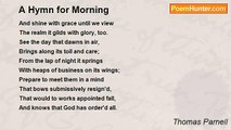 The beam-repelling mists arise, <br />And evening spreads obscurer skies; <br />The twilight will the night forerun, <br />And night itself be soon begun. <br />Upon thy knees devoutly bow, <br />And pray the Lord of glory now <br />To fill thy breast, or deadly sin <br />May cause a blinder night within. <br />And whether pleasing vapours rise <br />Which gently dim the closing eyes, <br />Which make the weary members bless'd <br />With sweet refreshment in their rest, <br />Or whether spirits in the brain <br />Dispel their soft embrace again, <br />And on my watchful bed I stay, <br />Forsook by sleep and waiting day, <br />Be God for ever in my view <br />And never He forsake me, too; <br />But, still as day concludes in night <br />To break again with new-born light, <br />His wondrous bounty let me find <br />With still a more enlighten'd mind <br />When grace and love in one agree, <br />Grace from God, and love from me, <br />Grace that will from heaven inspire, <br />Love that seals it with desire, <br />Grace and love that mingle beams, <br />And fill me with encreasing flames. <br />Thou that hast Thy palace far <br />Above the moon and every star, <br />Thou that sittest on a throne <br />To which the night was never known, <br />Regard my voice and make me bless'd, <br />By kindly granting its request. <br />If thoughts on Thee my soul employ, <br />My darkness will afford me joy, <br />'Till Thou shalt call, and I shall soar, <br />And part with darkness evermore.<br /><br />Thomas Parnell<br /><br />http://www.poemhunter.com/poem/a-hymn-for-evening/