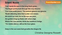 Your hands lie open in the long fresh grass, -- <br />The finger-points look through like rosy blooms: <br />Your eyes smile peace. The pasture gleams and glooms <br />'Neath billowing skies that scatter and amass. <br />All round our nest, far as the eye can pass, <br />Are golden kingcup-fields with silver edge <br />Where the cow-parsley skirts the hawthorn-hedge. <br />'Tis visible silence, still as the hour-glass. <br /> <br />Deep in the sun-searched growths the dragon-fly <br />Hangs like a blue thread loosened from the sky: -- <br />So this wing'd hour is dropt to us from above. <br />Oh! clasp we to our hearts, for deathless dower, <br />This close-companioned inarticulate hour <br />When twofold silence was the song of love.<br /><br />Dante Gabriel Rossetti<br /><br />http://www.poemhunter.com/poem/silent-noon-2/