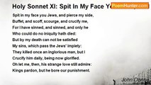 Spit in my face you Jewes, and pierce my side, <br />Buffet, and scoffe, scourge, and crucifie mee, <br />For I have sinn'd, and sinn'd, and onely hee, <br />Who could do no iniquitie, hath dyed: <br />But by my death can not be satisfied <br />My sinnes, which passe the Jewes impiety: <br />They kill'd once an inglorious man, but I <br />Crucifie him daily, being now glorified. <br />Oh let mee then, his strange love still admire: <br />Kings pardon, but he bore our punishment. <br />And Jacob came cloth'd in vile harsh attire <br />But to supplant, and with gainfull intent: <br />God cloth'd himselfe in vile mans flesh, that so <br />Hee might be weake enough to suffer woe.<br /><br />John Donne<br /><br />http://www.poemhunter.com/poem/holy-sonnet-xi-spit-in-my-face-you-jewes/