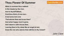 The frog half fearful jumps across the path, <br />And little mouse that leaves its hole at eve <br />Nimbles with timid dread beneath the swath; <br />My rustling steps awhile their joys deceive, <br />Till past, and then the cricket sings more strong, <br />And grasshoppers in merry moods still wear <br />The short night weary with their fretting song. <br />Up from behind the molehill jumps the hare, <br />Cheat of his chosen bed, and from the bank <br />The yellowhammer flutters in short fears <br />From off its nest hid in the grasses rank, <br />And drops again when no more noise it hears. <br />Thus nature's human link and endless thrall, <br />Proud man, still seems the enemy of all.<br /><br />John Clare<br /><br />http://www.poemhunter.com/poem/summer-evening/