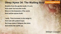 Breathe from the gentle south, O Lord, <br />And cheer me from the north; <br />Blow on the treasures of thy word, <br />And call the spices forth! <br /> <br />I wish, Thou knowest, to be resign'd, <br />And wait with patient hope; <br />But hope delay'd fatigues the mind, <br />And drinks the spirits up. <br /> <br />Help me to reach the distant goal; <br />Confirm my feeble knee; <br />Pity the sickness of a soul <br />That faints for love of Thee! <br /> <br />Cold as I feel this heart of mine, <br />Yet, since I feel it so, <br />It yields some hope of life divine <br />Within, however low. <br /> <br />I seem forsaken and alone, <br />I hear the lion roar; <br />And every door is shut but one, <br />And that is Mercy's door. <br /> <br />There, till the dear Deliverer come, <br />I'll wait with humble prayer; <br />And when He calls His exile home, <br />The Lord shall find him there.<br /><br />William Cowper<br /><br />http://www.poemhunter.com/poem/the-waiting-soul/
