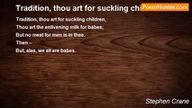 Tradition, thou art for suckling children, <br />Thou art the enlivening milk for babes; <br />But no meat for men is in thee. <br />Then -- <br />But, alas, we all are babes.<br /><br />Stephen Crane<br /><br />http://www.poemhunter.com/poem/tradition-thou-art-for-suckling-children/