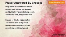 I ask'd the Lord, that I might grow <br />In faith, and love, and ev'ry grace, <br />Might more of his salvation know, <br />And seek more earnestly his face. <br /> <br />'Twas he who taught me thus to pray, <br />And he, I trust has answer'd pray'r; <br />But it has been in such a way, <br />As almost drove me to despair. <br /> <br />I hop'd that in some favour'd hour, <br />At once he'd answer my request: <br />And by his love's constraining pow'r, <br />Subdue my sins, and give me rest. <br /> <br />Instead of this. he made me feel <br />The hidden evils of my heart; <br />And let the angry pow'rs of hell <br />Assault my soul in ev'ry part. <br /> <br />Yea more, with his own hand he seem'd <br />Intent to aggravate my woe; <br />Cross'd all the fair designs I schem'd, <br />Blasted my gourds, and laid me low. <br /> <br />Lord, why is this, I trembling cry'd, <br />Wilt thou pursue thy worm to death? <br />"'Tis in this way," the Lord reply'd, <br />"I answer pray'r for grace and faith. <br /> <br />"These inward trials I employ, <br />"From self and pride to set thee free; <br />"And break thy schemes of earthly joy, <br />"That thou mayst seek thy all in me."<br /><br />John Newton<br /><br />http://www.poemhunter.com/poem/prayer-answered-by-crosses/