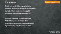 How I hail this morn's appearing! <br />It will thee, my love, restore: <br />Safety danger past endearing, <br />Sure we meet to part no more! <br /> <br />Fame is thine, lo! crowds aver it, <br />And her smile is dear to thee; <br />But I charge thee, don't prefer it <br />E'er again to home and me. <br /> <br />Thou, thy country's call obeying, <br />Hast her battles nobly fought; <br />And, thy ready zeal repaying, <br />See, she gives the laurels sought. <br /> <br />But have I no claims, my rover? <br />Claims as fondly dear to thee? <br />Yes, O yes! and, wandering over, <br />Thou wilt rest with love and me. <br /> <br />Ha! methinks, thy glances reading, <br />From thine eyes my fate I know; <br />Duty still love's claim impeding, <br />Thou again must seek the foe. <br /> <br />Of my fears too dread revival! <br />Yet, with tearful joy I see, <br />Duty is the only rival <br />Potent over love and me.<br /><br />Amelia Opie<br /><br />http://www.poemhunter.com/poem/to-henry-written-to-a-russian-air/