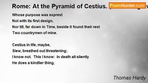 Who, then, was Cestius, <br /> And what is he to me? - <br />Amid thick thoughts and memories multitudinous <br /> One thought alone brings he. <br /> <br /> I can recall no word <br /> Of anything he did; <br />For me he is a man who died and was interred <br /> To leave a pyramid <br /> <br /> Whose purpose was exprest <br /> Not with its first design, <br />Nor till, far down in Time, beside it found their rest <br /> Two countrymen of mine. <br /> <br /> Cestius in life, maybe, <br /> Slew, breathed out threatening; <br />I know not. This I know: in death all silently <br /> He does a kindlier thing, <br /> <br /> In beckoning pilgrim feet <br /> With marble finger high <br />To where, by shadowy wall and history-haunted street, <br /> Those matchless singers lie . . . <br /> <br /> --Say, then, he lived and died <br /> That stones which bear his name <br />Should mark, through Time, where two immortal Shades abide; <br /> It is an ample fame.<br /><br />Thomas Hardy<br /><br />http://www.poemhunter.com/poem/rome-at-the-pyramid-of-cestius-near-the-graves-o/